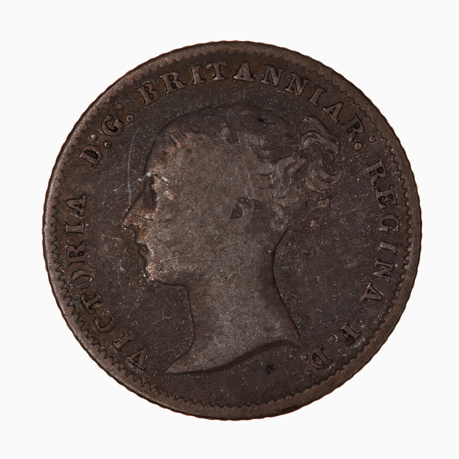 Head of the Queen facing left, ribbon in hair; around, VICTORIA D: G: BRITANNIAR: REGINA F: D: