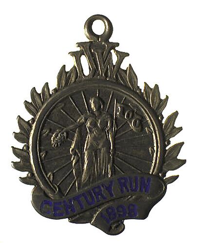 The medal is made up of a wheel set on a victory wreath. At the top are the letters LVW (League of Victorian Wheelmen). A female figure, perhaps representing the colony of Victoria, holds a flag inscribed "100" and offers a wreath. The cycle racing craze of the 1890s saw the replacement of the penny-farthing as the racing cycle of choice by cycles of a more modern appearance. In 1891 the Exhibition Buildings constructed the colony's main cycle racing track where the entrance foyer of Museum Victoria now stands. Two years later the League of Victorian Wheelmen was established, and became the governing body of the sport. Its mission was 'to advance racing and touring and the trade of cycling in all the lands under the Southern Cross'. 'We firmly believe that cycling has a great future (with the) beautiful models of perfection as (we seen in) the bicycle of the present day world. (We) anticipate the pleasures extending (and) advocate sweeping away the terms amateur and professional' (Australian Cyclist Journal 7 September 1893).