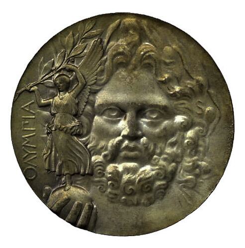 Large head of Zeus laureate facing, his hand holds a globe on left on which stands Nike holding aloft an olive branch; at left in Greek, OLYMPIA