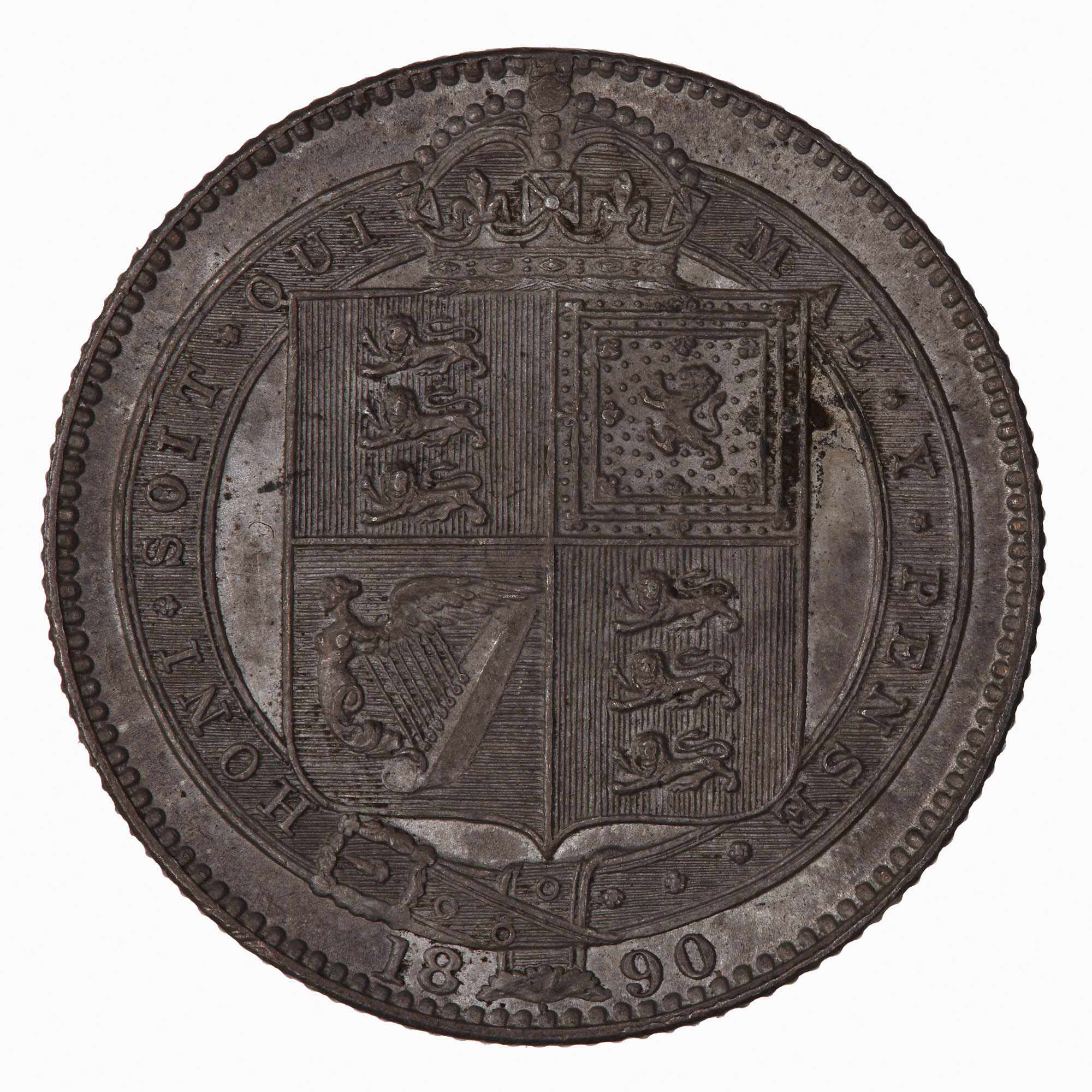 Within the Garter, crowned square shield quartered with the arms of England (1 & 4), Scotland (2) and Ireland (3); motto on Garter, HONI SOIT QUI MAL Y PENSE; below, divided by the base of the Garter, 1890