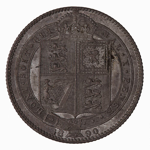 A shilling is a 12 pence coin. Struck as part of a new coinage in gold and silver to commemorate the Golden Jubilee of Queen Victoria, 1837-1887. The coins all shared a new 'Jubilee' obverse of the Queen by Boehm, adapted from his own Jubillee medal. The new obverse proved unpopular but was used until 1893. The reverse is adapted from the shilling of George IV used from 1823 to 1825.