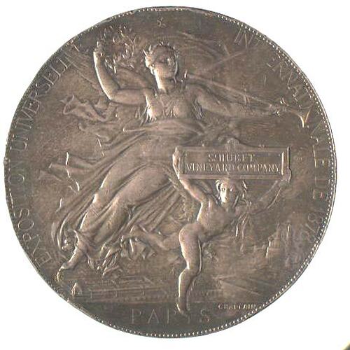 This is a silver prize medal won at the Paris International Exhibition of 1878 by the Victorian winery St. Huberts Vineyard Company. Success in international wine competitions was seen as a key marketing advantage to the Victorian wine makers in the 19th century. St. Hubert's, in the Yarra Valley, was among the more successful wine makers. Established in 1862, it is still in business today. The medal was designed by Jules-Clement Chaplain. This medal marks the emergence of Art Nouveau design in medals. Chaplain retained the basic neo-classical themes - including Victory bearing a wreath - but his depiction is rich with movement and his composition emerges from the background in flowing lines. Chaplain was one of the most significant of a group of Parisian medallists who adapted their designs to make maximum use of new reduction technology, placing Paris again at the centre of the medallic world. In 1877 he was named the official medallist of the French government; in 1878 he was named a chevalier of the Legion of Honor; and in 1881 was given the seat at the Académie des Beaux Arts. He was responsible for the official portraits of every president of the French Republic from Edme Patrice Mac-Mahon in 1877 to Émile Loubet in 1899. He was commissioned to engrave the gold coinage of France; his gold medal commemorating the visit of Czar Nicholas and Czarina Alexandra of Russia to Paris in 1896 was thought to be one of the finest ever struck.