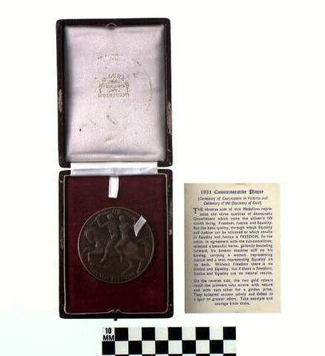 1951 marked the centenary of Victoria's separation from the colony of New South Wales. As part of the celebrations, the Victorian Government commissioned this medal from Andor Mészáros. Drawing on his classical background, Meszaros developed the imagery for 'Equality and Justice through Freedom'. The man holding the torch represents equality; the blindfolded woman holding a sword is the symbol of justice, and both are mounted on a horse that has broken its shackles. It features on the reverse a design of a pair of gold prospectors working a sluice on the reverse. There was another version of this medal which depicted a banksia and bottlebrush. The medal was intended to be presented to notable individuals; this one was not awarded to anyone.