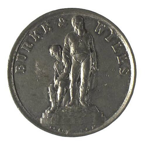Plain (edge) BURKE & WILLS/[]A SC [T] S M Statue of Burke & Wills (obverse) IN COMMEMORATION OF AUSTRALIA BEING FIRST CROSSED/BY/BURKE/WILLS/KING/AND/ /GRAY/IN/1861(reverse)
