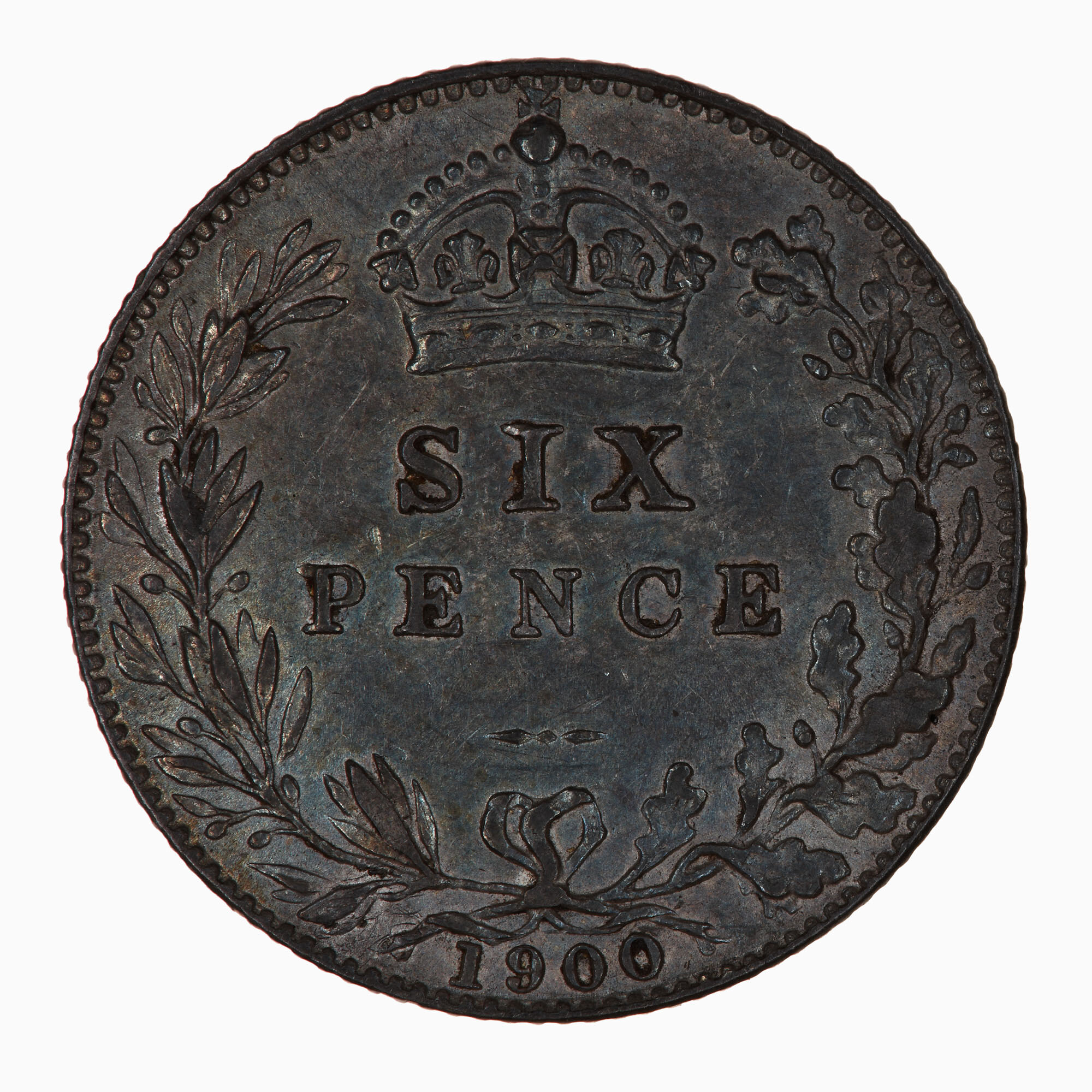 Within an open wreath of laurel and oak leaves below a crown, SIX / PENCE; below, 1890