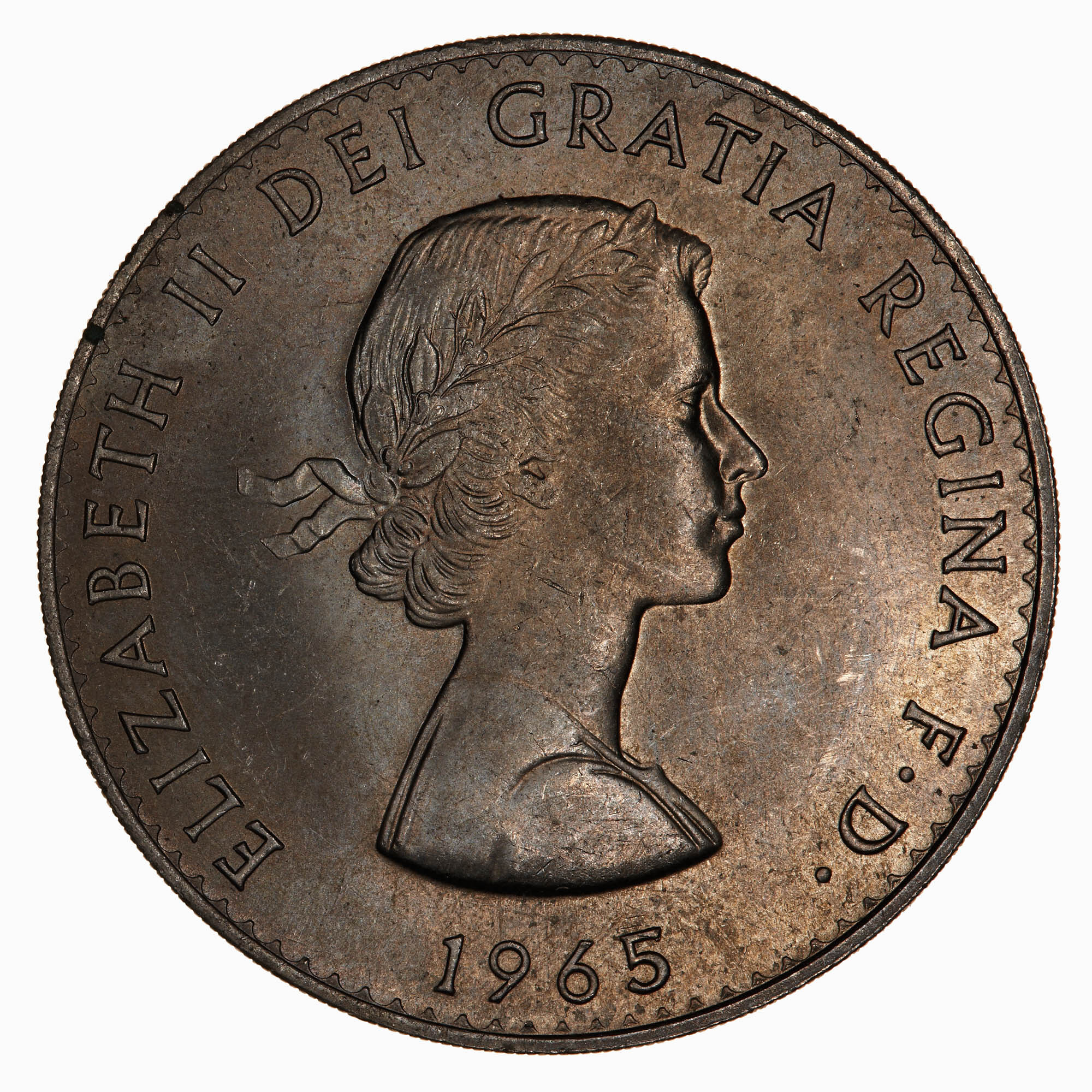 Laureate bust of the Queen facing right; incuse on bust truncation the artist's initials, MG (Mary Gillick); around, ELIZABETH II DEI GRATIA REGINA F. D,; below, 1965