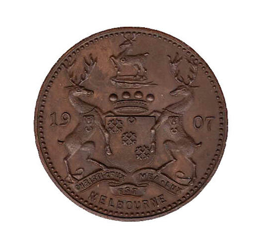 Coat of arms of Baron Northcote (third Governor-General of Australia) dividing 19 07; below: CHRISTICRUX (?) / MEA . LUX / EST / MELBOURNE