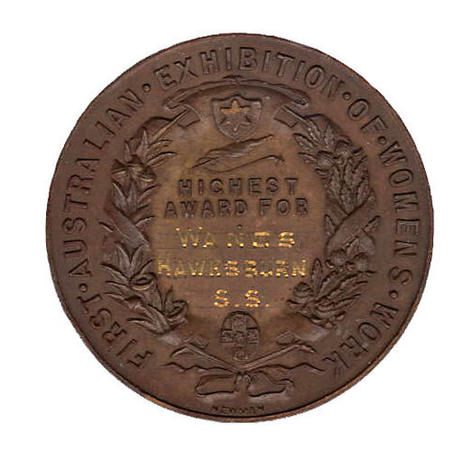 This is a bronze prize medal of the 1907 first Australian exhibition of women's work which was held at the Exhibition Building. It was won by students of Hawksburn State School for an exhibit of wands. This was an important national exhibition that was seen as uniting the new nation through the work of women. Hawksburn State School was situated between Malvern and Surrey Roads in Hawksburn, 5 km south-east of Melbourne. It opened in 1875 as the Prahran primary school, was renamed North Prahran in the 1880s and finally became Hawksburn in 1906, a year before this medal was issued. The headmaster at the time the medal was awarded was C. S. Halkyard. The school finally closed in the early 1990s.