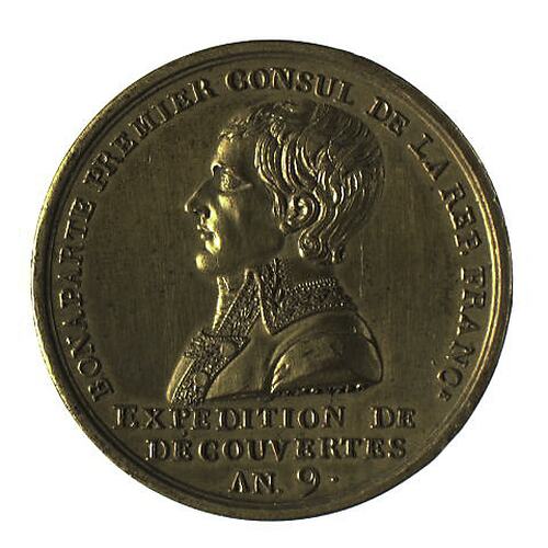 Bust of Napoleon left, around, BONAPARTE PREMIER CONSUL DE LA REP. FRANCE; below, EXPEDITION DE / DECOUVERTES / AN. 9