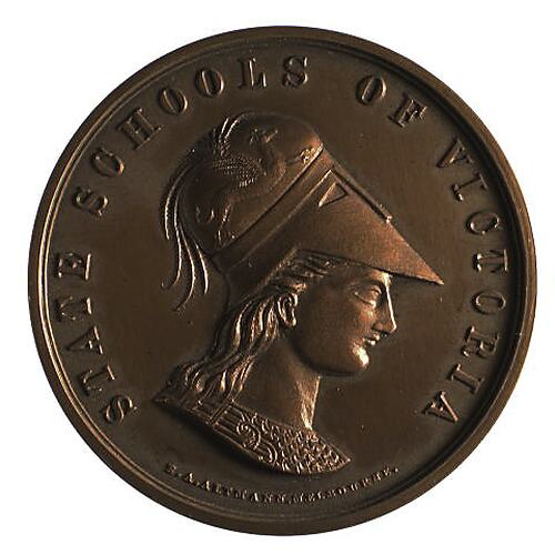 Profile bust the ancient Greek goddess Athena facing right, wearing a Corinthian helmet decorated with a griffin; around, STATE SCHOOLS OF VICTORIA; below in small letters, E.A. ALTMANN. MELBOURNE.