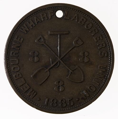 At centre crossed spade, shovel and bale hook; in angles, 8 8 8 ; around, .MELBOURNE WHARF LABORERS UNION . 1885