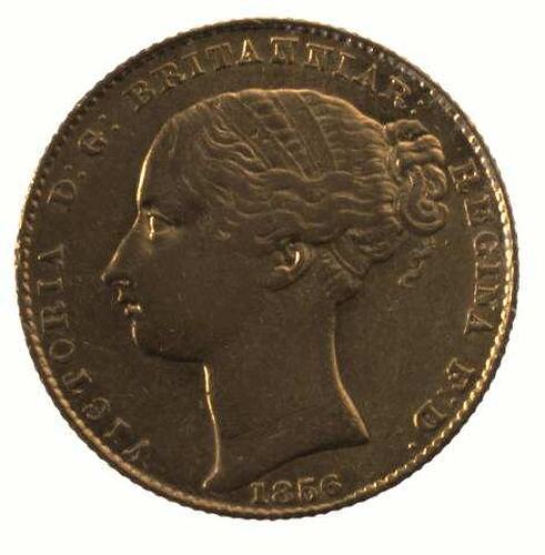 A gold coin (21.5 mm diameter with milled edge) featuring a head of Queen Victoria facing left, her hair plain and filleted; the legend, VICTORIA D:G: BRITANNIAR: REGINA F:D: around and the date, 1856 below. The reverse features the word AUSTRALIA below a royal crown within a wreath of laurel; around above, SYDNEY MINT, around below, ONE SOVEREIGN