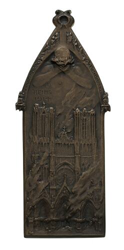 Arch shaped medal with scene of burning Rheims Cathedral. In the apex above the flames is a figure representing Christ whose bowed head wears a wreath. His concealed face is buried in his hands as a single teardrop falls onto the burning building below.