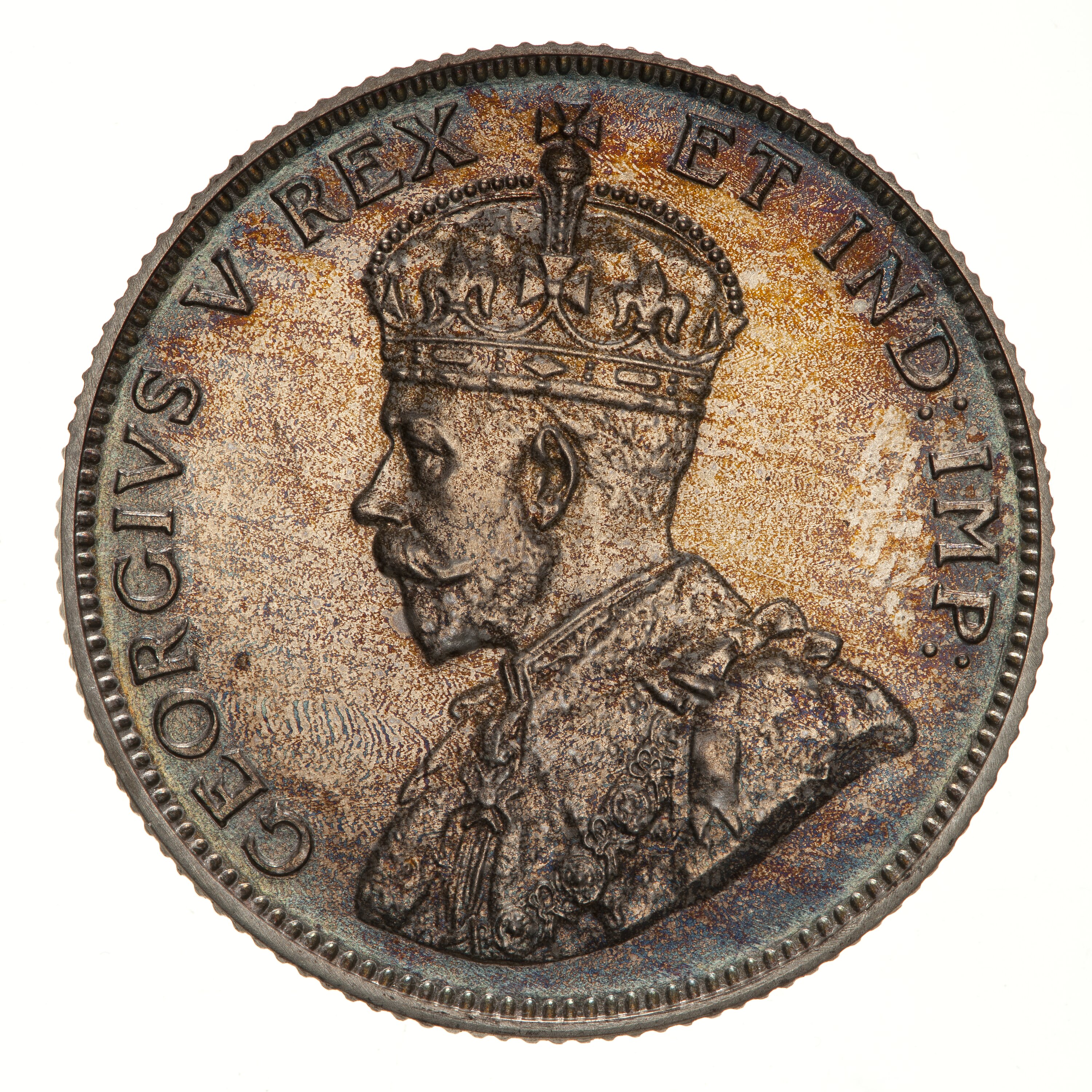 Crowned and draped bust of the King facing left, the King is wearing the Imperial Crown and the ermine Robe of State, the Collar of the Most Noble Order of the Garter, and the Badge of the Most Honourable Order of the Bath; around, GEORGIVS V REX ET IND: IMP:; artist's initial's, BM, on bust truncation