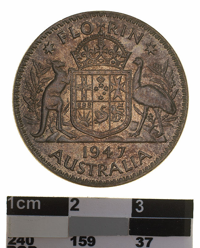 A silver coin (28 mm diameter with milled edge) featuring a bare head of George VI facing left; around, GEORGIVS VI D:G: BR: OMN: REX F.D. IND: IMP: ; below bust in small lettering the artist's initials H.P. The reverse is based on the arms of the Commonwealth of Australia, as authorised by Royal Warrant 19 September 1912 - composed of a shield divided into six parts, each containing a representation of the badge of a State (although that of South Australia is depicted as three sheaves of wheat above a rising sun instread of the authorised Piping Shrike). The shield is supported by a kangaroo and an emu standing on a grassy mound accompanied by small branches of wattle. Above the shield is a crown instead of the Federation star. Around above, FLORIN between two seven pointed stars; and below, in the exergue, the date, 1947 curved below which, AUSTRALIA. The artist's initials KG are in the field above the back of the emu.