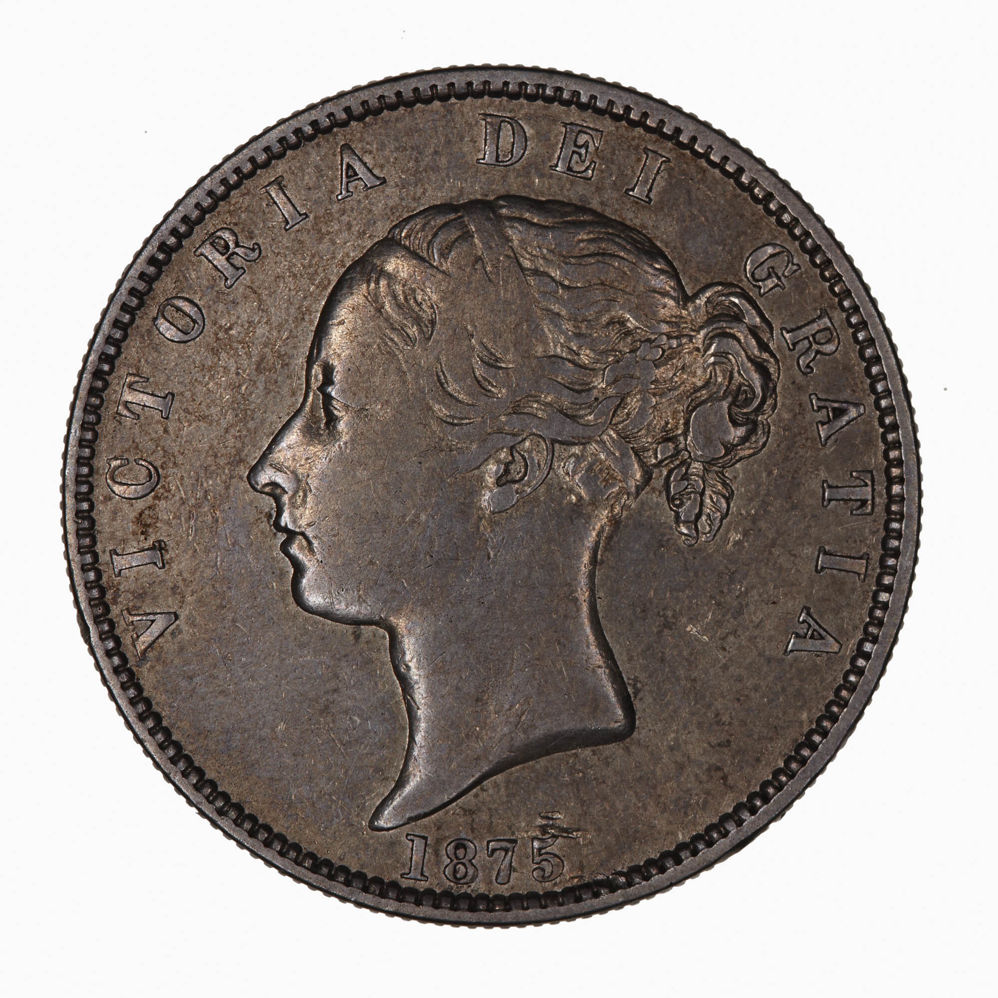 Head of the Queen facing left, ribbon in hair; around, VICTORIA DEI GRATIA; below, 1875