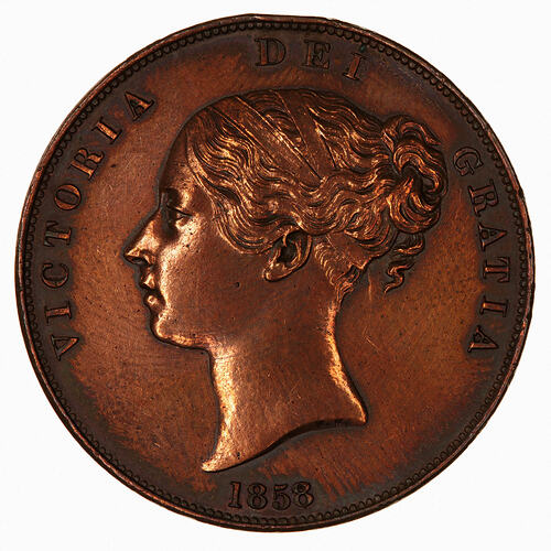 Head of Queen Victoria facing left, ribbon in her hair; incuse on neck truncation the artist's initials W.W. (William Wyon); around, VICTORIA DEI GRATIA; below, 1858 (last 8 over 7)