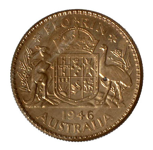 Based on the arms of the Commonwealth of Australia, as authorised by Royal Warrant 19 September 1912 - composed of a shield divided into six parts, each containing a representation of the badge of a State (although that of South Australia is depicted as three sheaves of wheat above a rising sun instread of the authorised Piping Shrike). The shield is supported by a kangaroo and an emu standing on a grassy mound accompanied by small branches of wattle. Above the shield is a crown instead of the Federation star. Around above, FLORIN between two seven pointed stars; below, in the exergue, the date, 1946 curved below which, AUSTRALIA. The artist's initials KG are in the field above the back of the emu.