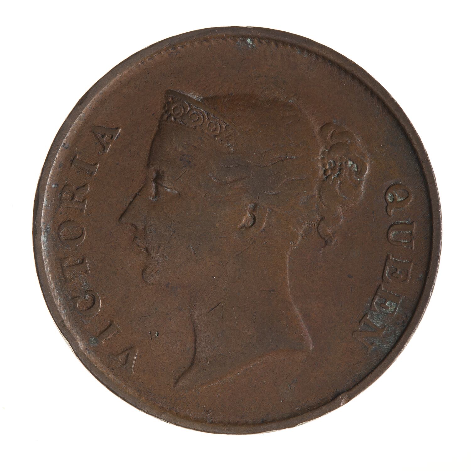 Within a laurel wreath, ONE / CENT; around above, EAST INDIA COMPANY; below, 1845