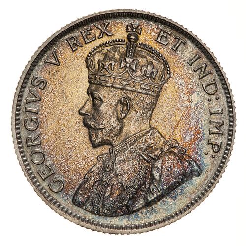 Crowned and draped bust of the King facing left, the King is wearing the Imperial Crown and the ermine Robe of State, the Collar of the Most Noble Order of the Garter, and the Badge of the Most Honourable Order of the Bath; around, GEORGIVS V REX ET IND: IMP:; artist's initial's, BM, on bust truncation