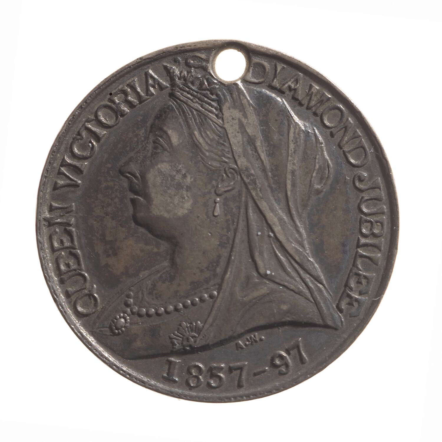 Veiled bust of Queen Victoria facing left; around above, QUEEN VICTORIA DIAMOND JUBILEE; below, 1837 - 97 Above date artist's initials, A.W.