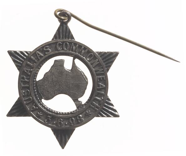 Map of Australia, voided within ring; on ring, AUSTRALIA'S COMMONWEALTH * 3-6-98 *; from the ring a series of rays form the six points of a star the top one of which has a loop with attached pin for wearing. The map of Australia is divided into the six colonies / states with each ray representing one.