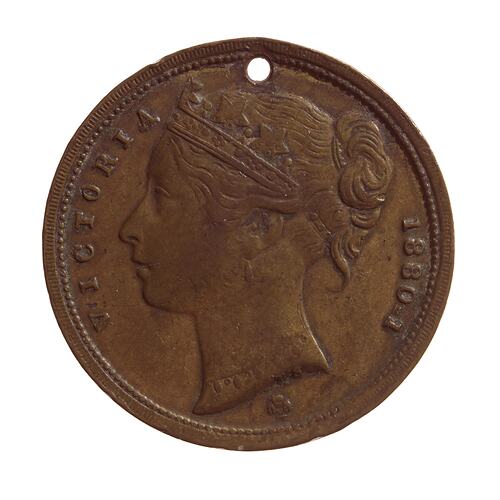 Copper medal, 22mm diameter, with hole pierced at top for hanging. The obverse features the head of a youthful Queen Victoria facing left, wearing a coronet (featuring stars) and necklace; clover below head. Inscribed on both sides.
