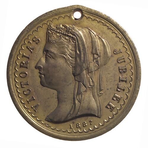 Other Details: Queen Victoria's 50th jubilee in 1887 was celebrated the great enthusiasm throughout the British Empire. This medal was one of many issued by local governments to commemorate the occasion. It was issued by the Shire of Hampden. The Shire of Hampden was centered on Port Campbell, on the west coast of Victoria, with a narrow strip of land northward including Camperdown, Lismore, Cobden, Shipton and Darlington. The Shire of Hampden was proclaimed on 31 December 1863.