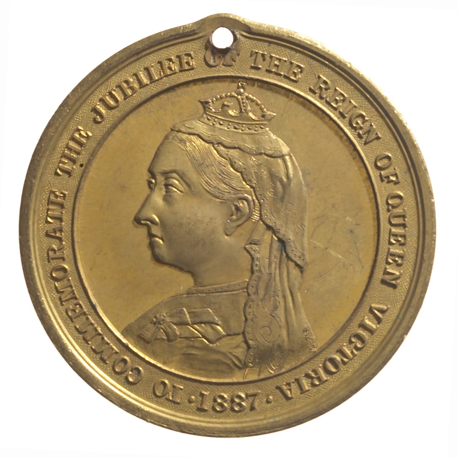 Bust of Queen Victoria left but with head slightly front so that her right eye can just be seen, wearing small crown. Around, TO COMMEMORATE THE JUBILEE OF THE REIGN OF QUEEN VICTORIA . 1887 .