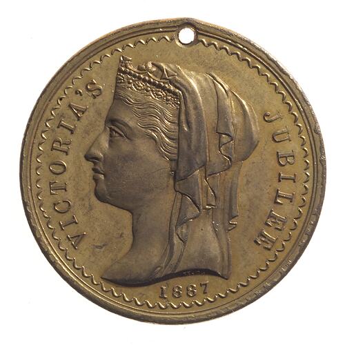 Head of Queen Victoria facing left, wearing veil and coronet; Around, VICTORIA'S JUBILEE Below, 1887. Inscription on truncation of Queen's neck: H.S.