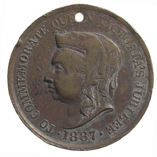 Head of Queen Victoria veiled left; around, TO COMMEMORATE QUE[E]N VICTORIA'S JUBILEE . 1887 .