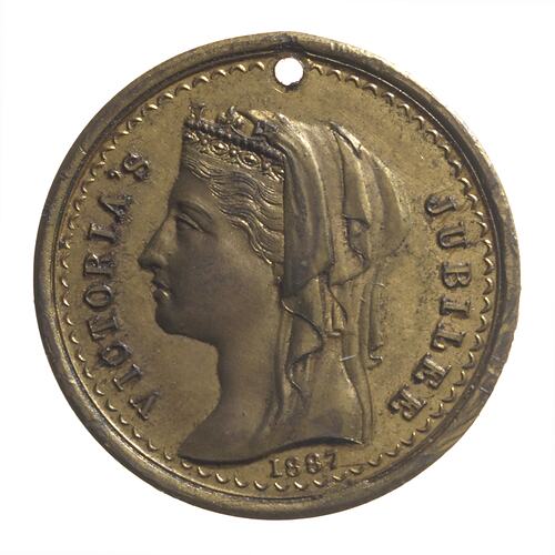 Crowned and veiled head of Queen Victoria left; around, VICTORIA JUBILEE 1887 In small letters on neck, STOKES & MARTIN