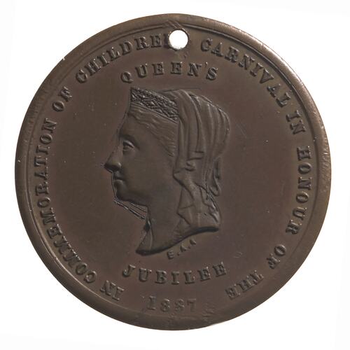 Head of Queen Victoria left, wearing vein and coronet; around, IN COMMEMORATION OF CHILDRE[N'S] CARNIVAL IN HONOUR OF THE; above head, QUEEN'S; below, JUBILEE / 1887 In tiny letters below the head the artists initials, E.A.A.