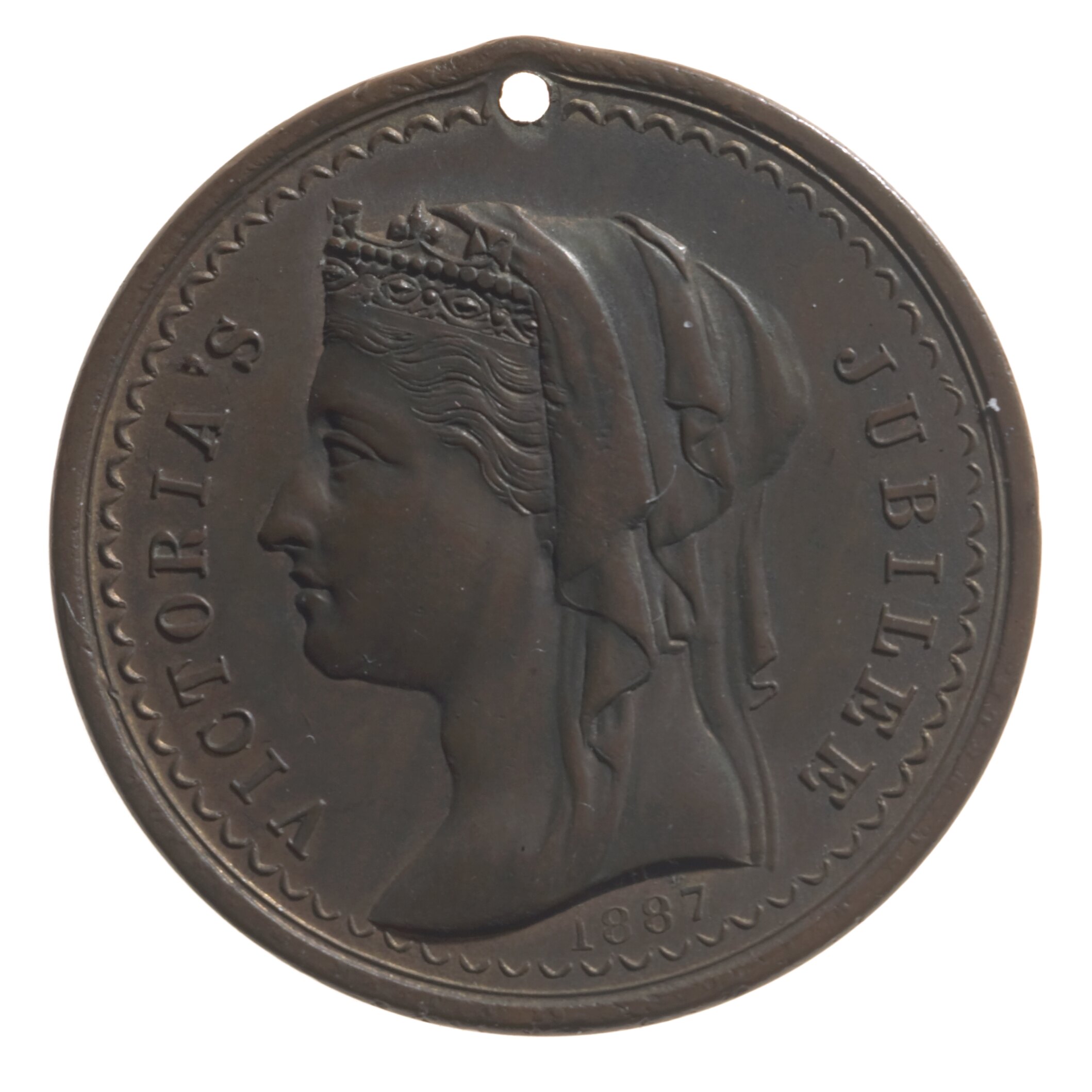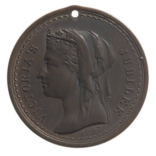 Head of Queen Victoria veiled and wearing coronet left; around, VICTORIA'S JUBILEE below, 1887