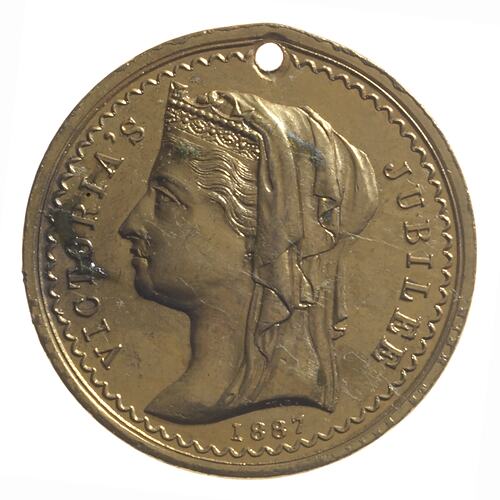 The fiftieth anniversary of the ascension of Queen Victoria was celebrated with enthusiasm throughout the Empire. This gilt medal was one of many issued by local organistions to commemorate the occasion.
