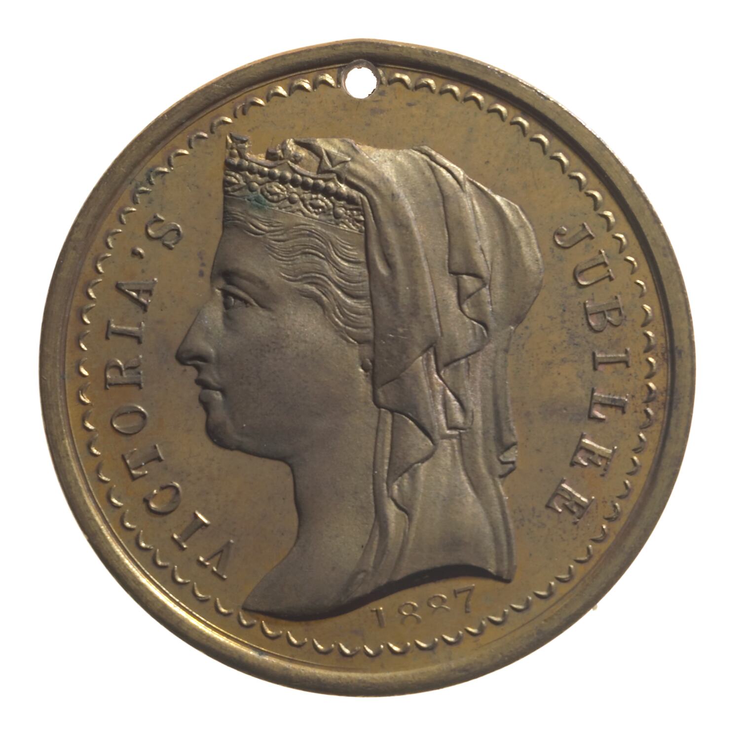 Head of Queen Victoria wearing veil and coronet facing left; around, VICTORIA'S JUBILEE below, 1887