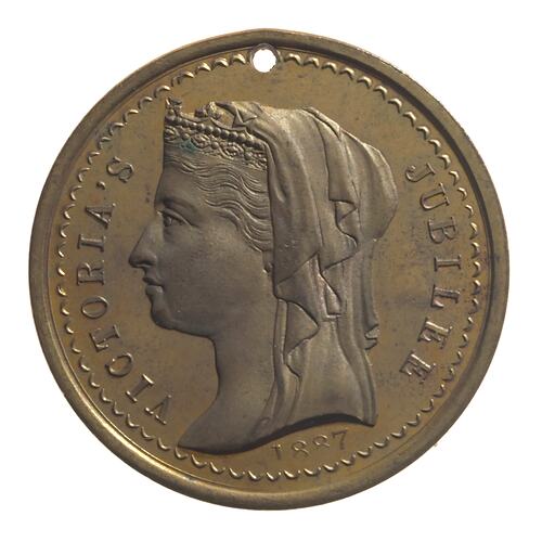 The fiftieth anniversary of the ascension of Queen Victoria was celebrated with enthusiasm throughout the Empire. This gilt medal was one of many issued by local organistions to commemorate the occasion.