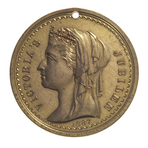 The fiftieth anniversary of the ascension of Queen Victoria was celebrated with enthusiasm throughout the Empire. This gilt medal was one of many issued by local organistions to commemorate the occasion.