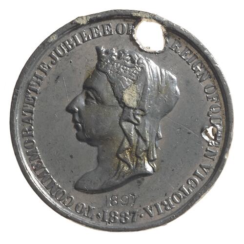 Other Details: The fiftieth anniversary of the ascension of Queen Victoria was celebrated with enthusiasm throughout the Empire. This medal was one of many issued by local organistions to commemorate the occasion. It was struck in white metal.