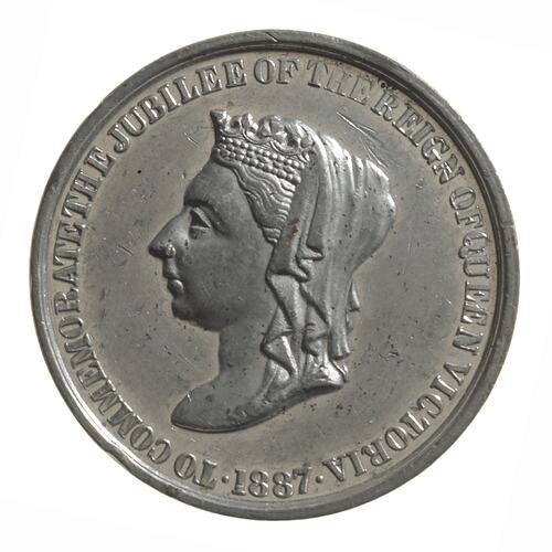 Head of Queen Victoria veiled and wearing coronet; around, TO COMMEMORATE THE JUBILEE OF THE REIGN OF QUEEN VICTORIA . 1887 .
