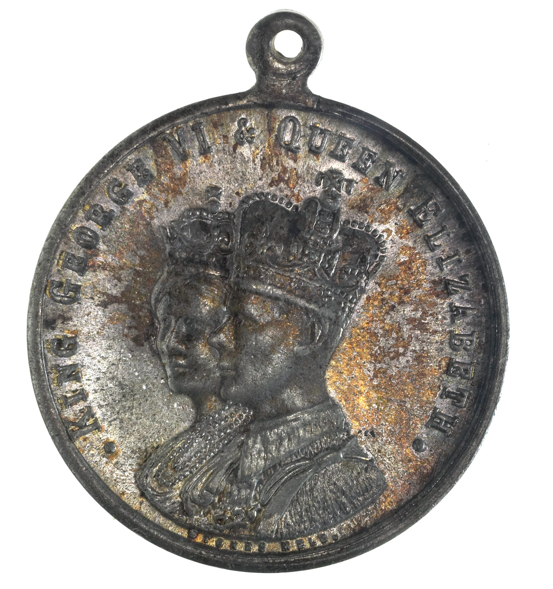 Conjoined crowned busts left; around, .KING GEORGE VI & QUEEN ELIZABETH. Below busts, in small letters, the makers name, STOKES MELB.