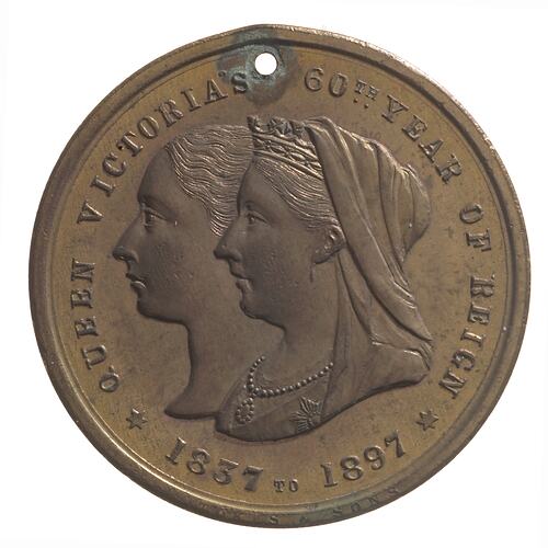 Jugate busts, young & old Queen Victoria; around, QUEEN VICTORIA'S 60TH YEAR OF REIGN * 1837 TO 1897 *; makers name, STOKES & SONS, in tiny letters on rim below dates