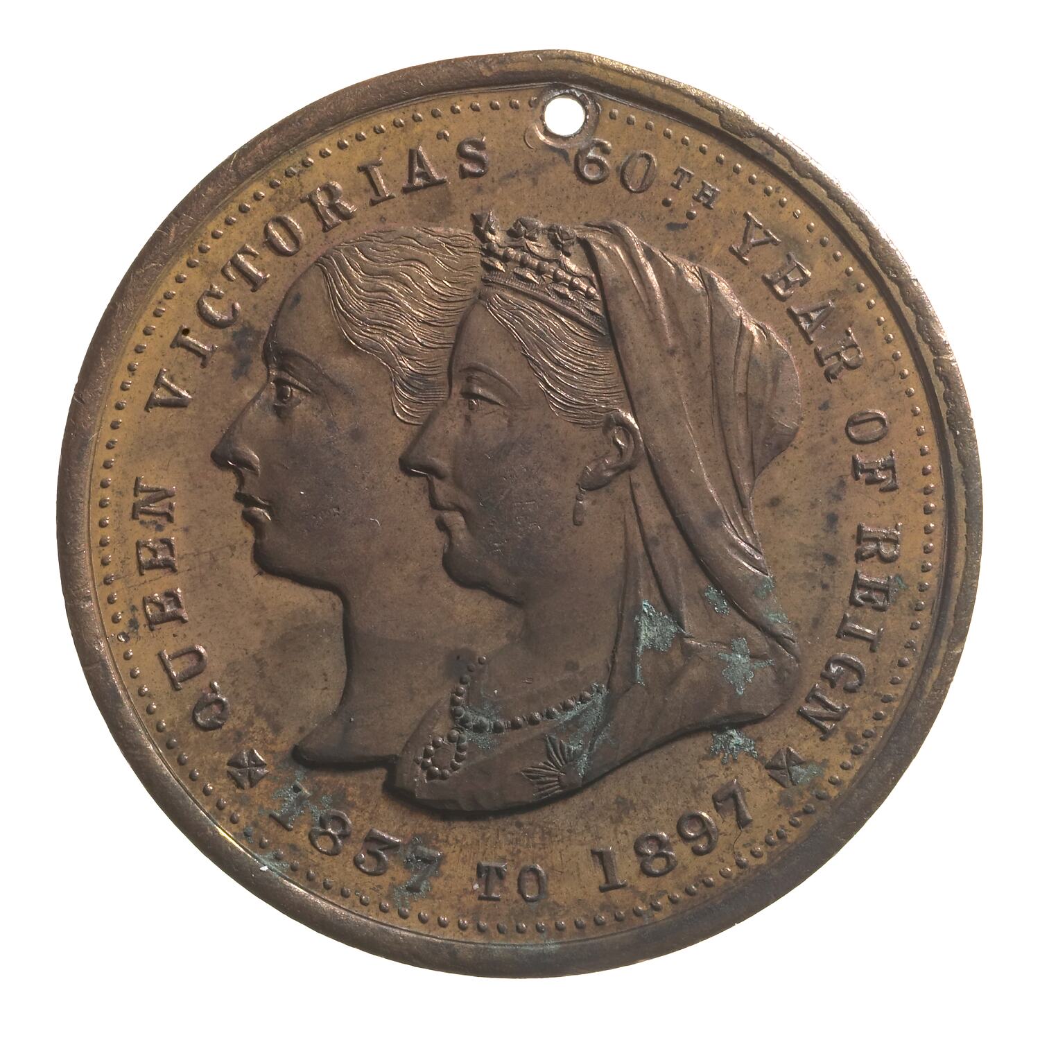 Jugate busts, young & old Queen Victoria; around, QUEEN VICTORIA'S 60TH YEAR OF REIGN * 1837 TO 1897 * (stops on either side of date in form of crosses);