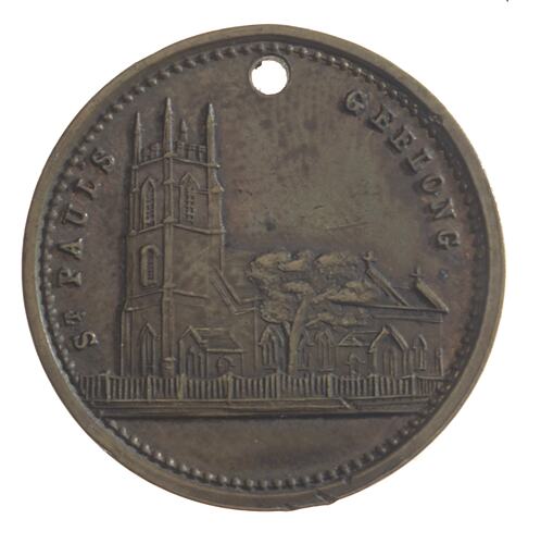 Other Details: Medal issued in 1904 to commemorate the 50th Jubilee of the establishment of St Paul's Anglican Church in La Trobe Terrace, Geelong. Register of the National Estate citation: 'St Paul's Church of England, a brick building with freestone dressings, was erected between 1850-1855. Construction of the Church was considerably delayed by the gold rushes in Victoria. This notable early English Gothic-style church by distinguished and classically trained architect, Charles Laing, is clearly modelled on English parish church architecture of the early nineteenth century. The use of brick instead of stone is an unusual development in Geelong and reflects the influence of English practice. St Paul's is a familiar Geelong landmark and an important centre of the Anglican faith in the town. Geelong architects, Snell and Kawerau (1853) and later Snell and Prowse (1855) were responsible for its completion.'
