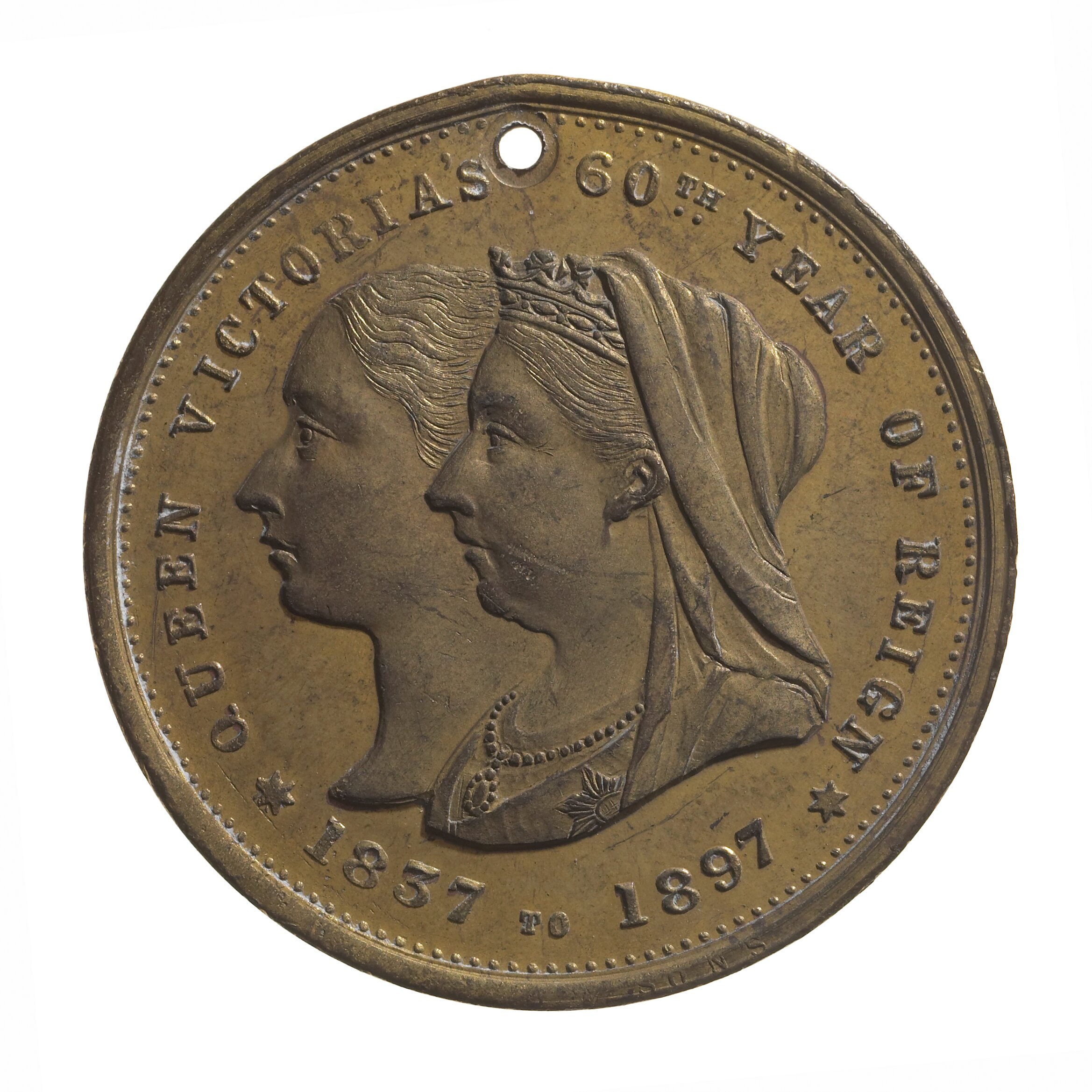 Jugate busts, young & old Queen Victoria; around, QUEEN VICTORIA'S 60TH YEAR OF REIGN * 1837 TO 1897 * (stops on either side of date in form of stars).