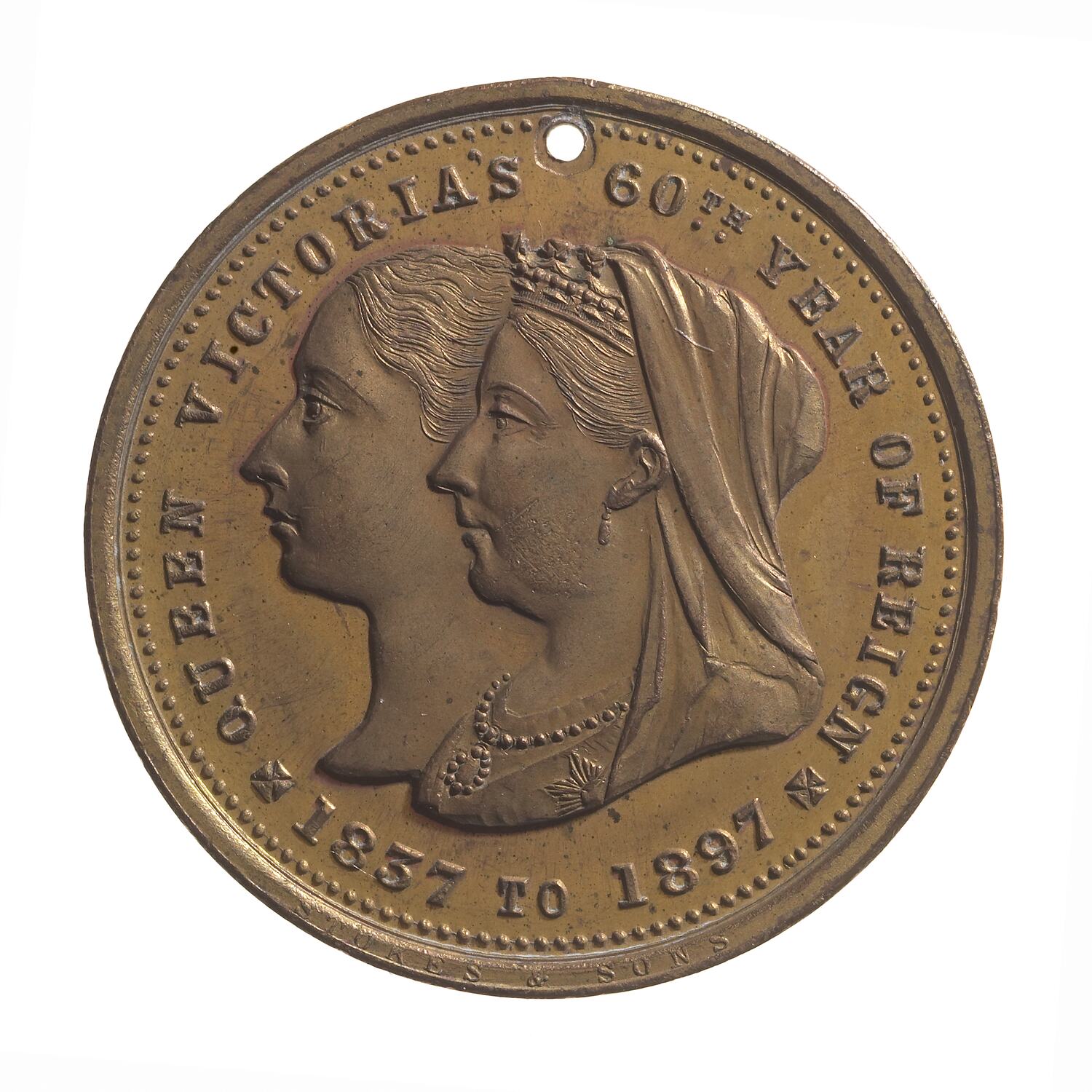 Jugate busts, young & old Queen Victoria; around, QUEEN VICTORIA'S 60TH YEAR OF REIGN * 1837 TO 1897 * (stops on either side of date in form of crosses); Mint name, STOKES & SONS in tiny letters on rim below date.