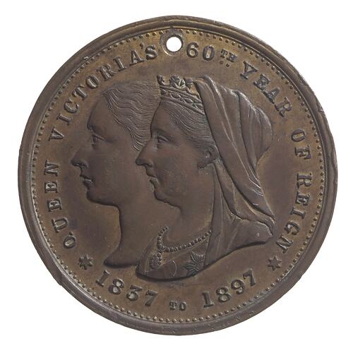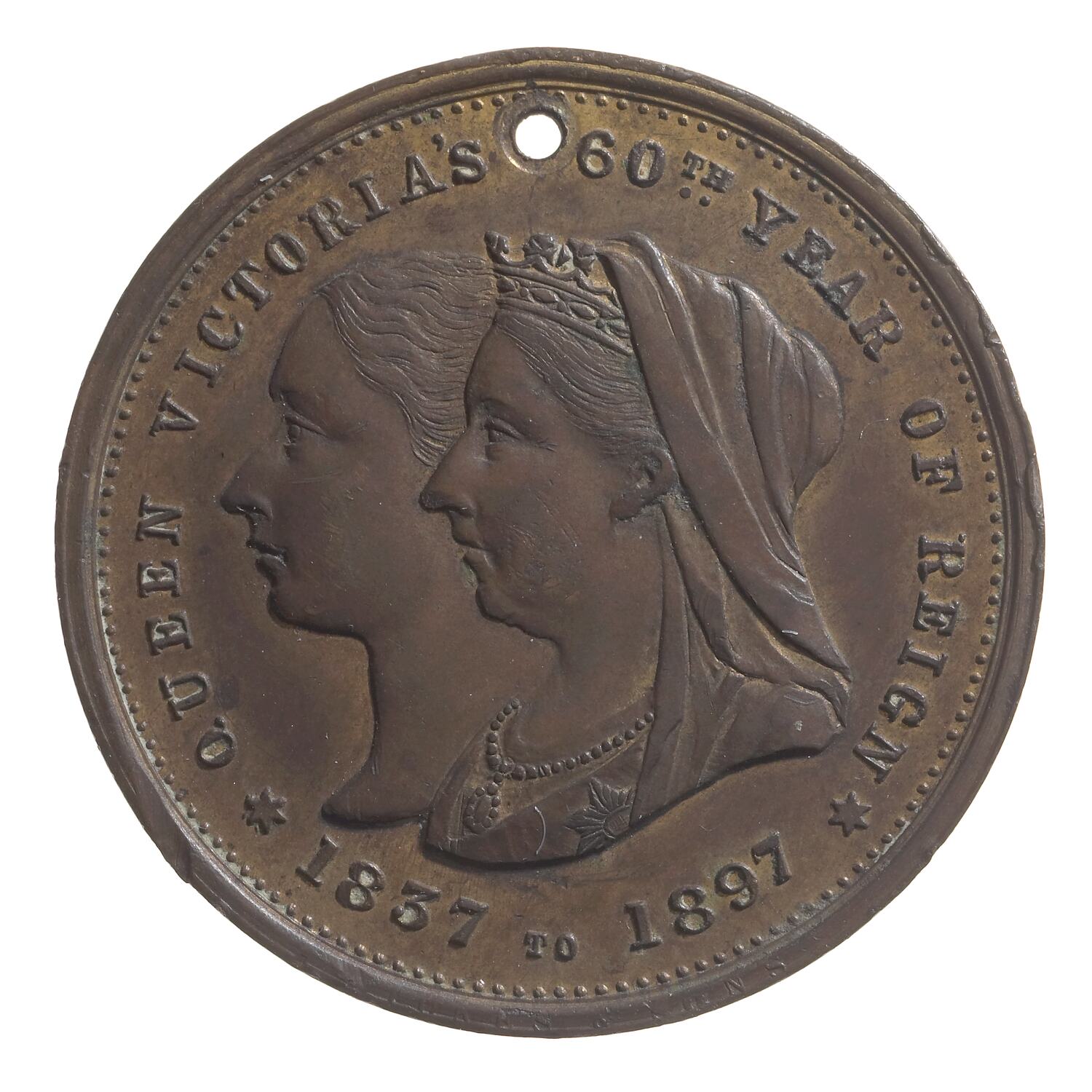 Jugate busts, young & old Queen Victoria; around, QUEEN VICTORIA'S 60TH YEAR OF REIGN * 1837 TO 1897 * (stops on either side of date in form of stars). Mint name, STOKES & SONS in tiny letters on rim below date.
