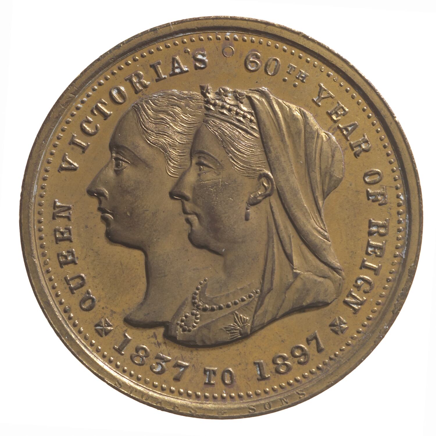 Jugate busts, young & old Queen Victoria; around, QUEEN VICTORIA'S 60TH YEAR OF REIGN + 1837 TO 1897 +; (around rim below dates in tiny letters the mint name:STOKES & SONS