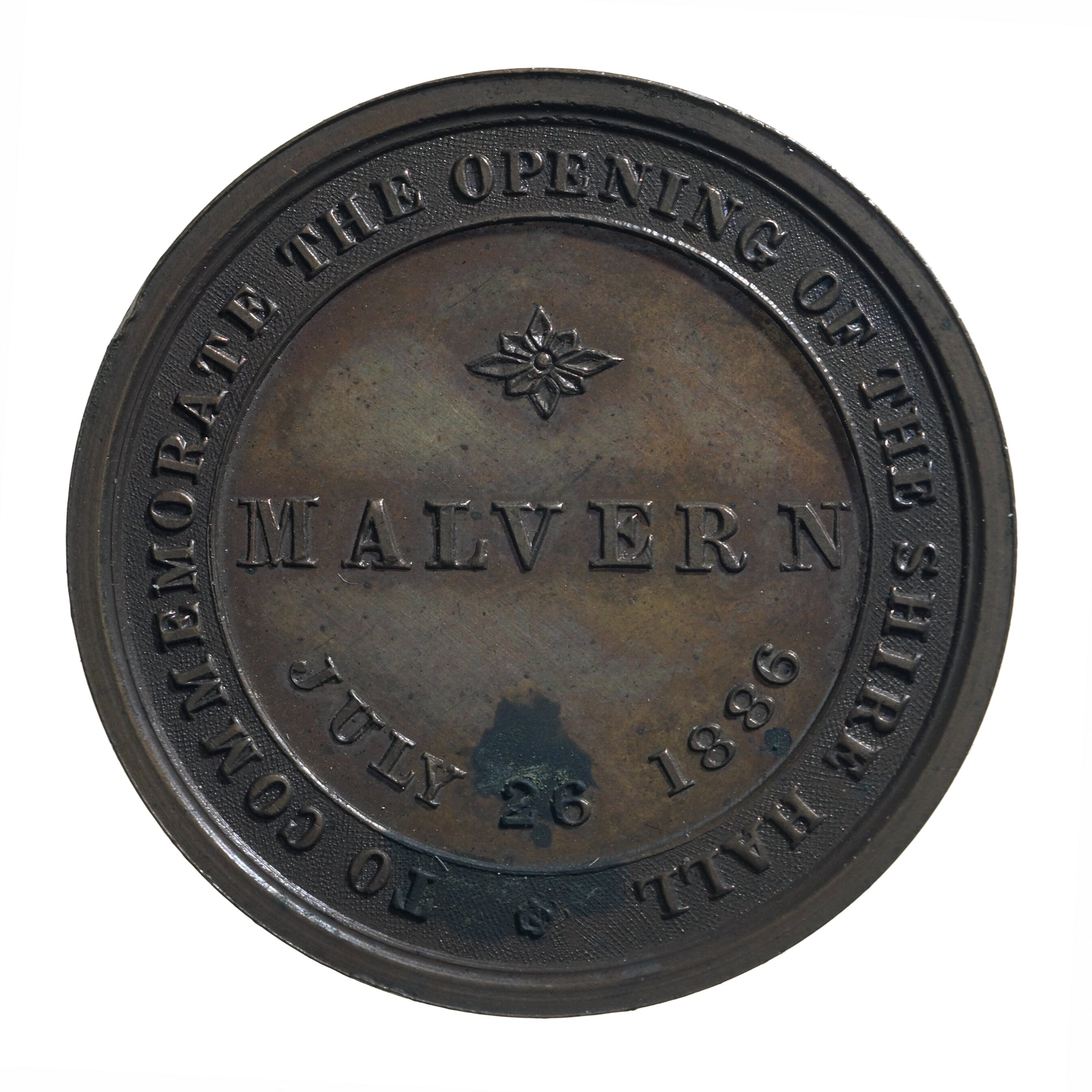 At centre below star like ornament; MALVERN / JULY 25 1886; around, . TO COMMEMORATE THE OPENING OF THE SHIRE HALL