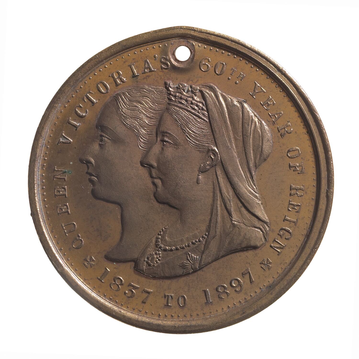 Jugate busts, young & old Queen Victoria; around, QUEEN VICTORIA'S 60TH YEAR OF REIGN * 1837 TO 1897 * (stops on either side of date in form of crosses).